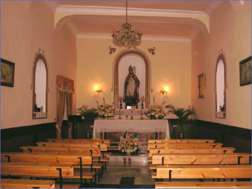 El interior de la nave consiste en un único espacio en el que el presbiterio aparece marcado por una ligera elevación respecto al suelo. En su alzado Oeste presenta una pequeña ventana obocinada que constituye la única fuente de iluminación del Interior. La sacristía ocupa el cuerpo inferior de la torre y se accede a través de un arco de medio punto. El espacio de la nave está cerrado por una cubierta plana de cañizo y yeso compartimentada en cuatro espacios rectangulares por vigas de madera que sustentan el cañizo la nave. En cuanto a la torre, desde el exterior se observa como no está ensamblada con la cabecera, lo que indica que la torre es de una cronología posterior a la nave. Ante la ausencia de documentación que confirme nuestras hipótesis, creemos que la nave puede corresponder a la ermita del siglo XVI, o al menos mantener su tipología, mientras que la torre es una construcción posterior del siglo XVIII.
