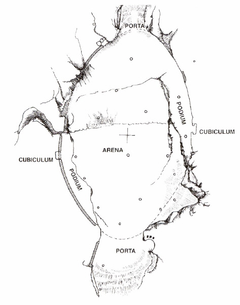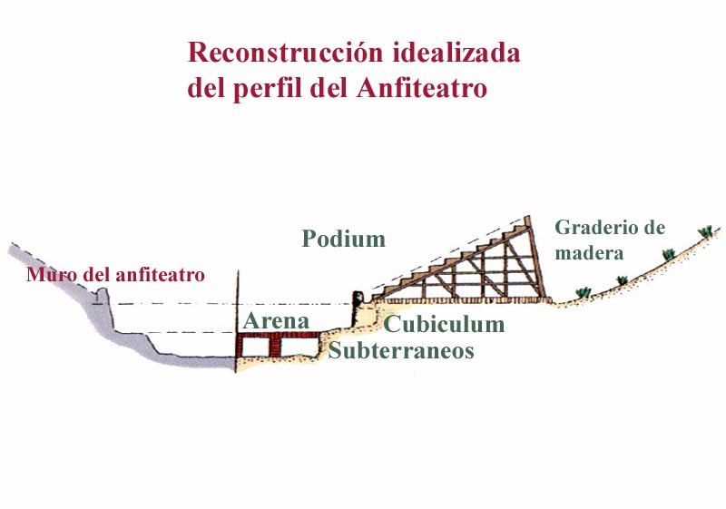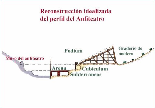 Sus muros longitudinales, completamente ovales en planta, son de sólido mortero, con alzado de mampostería. La arena formaba una elipse de 43 metros por 26'6 m. semejante, por tanto a la mayoría de las construcciones locales conocidas, como el de Carmona, por ejemplo. En los extremos del eje menor y en el muro del podium aparecen sendas construcciones excavadas, de pequeñas dimensiones, tratándose de habitáculos o burladeros (cubiculum) de función poco clara, pero muy características de estos edificios. Los graderíos (cavea), divididos en dos o tres niveles relacionados con la clase social que las ocupaban, serian de madera, como en Ampurias (Gerona) Caparra (Cáceres), entre otros muchos.