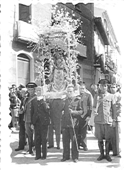 La carretera en recta, ofrece aspecto impresionante. Detrás de la Imagen el Clero, Autoridades y las apretadas filas de Falange y Organizaciones Juveniles con sus jerarquías. Desfila lentamente la procesión. Apenas inician su marcha las andas y ya la Cruz llega al pueblo, distante dos kilómetros.