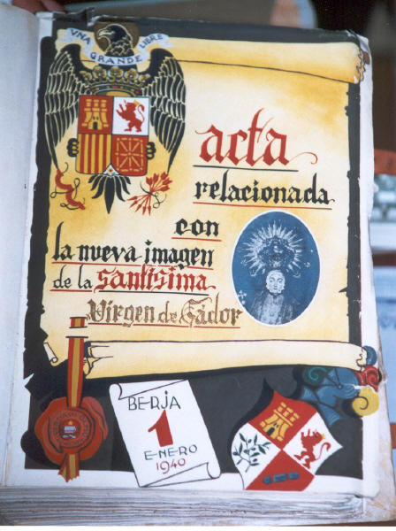 He aquí un interesantísimo protocolo notarial que fue levantado al término de la Guerra Civil por el notario de Berja D. Manuel García del Olmo. En él se describen, con todo lujo de detalles, los avatares de la destrucción de la imagen de la Virgen de Gádor, así como la realización y venida de la nueva talla. Sobre el mismo dirá el notario que se hizo “…habiendo procurado reflejar no el hecho escueto sino el más real y positivo entusiasmo y fervor de un pueblo por su Virgen”.